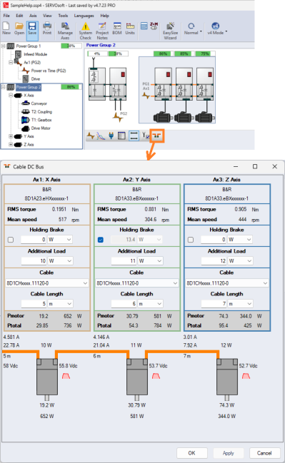 Cables can be selected in the Cable DC Bus form, launched from the Main form as shown. This example shows Power Group 1, mounted in a cabinet, with an Auxiliary Power Module (APM) in Slot 2, stepping down the DC Bus from 540Vdc to 58Vdc to feed Power Group 2.