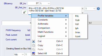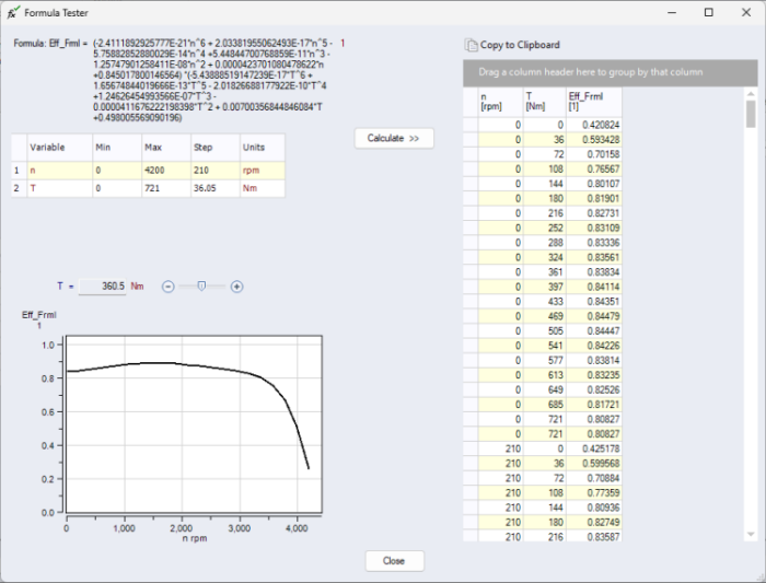 The example below shows a rather involved formula for the Gearbox Effiiciency, which varies with the variables input speed [n] and output torque [T].