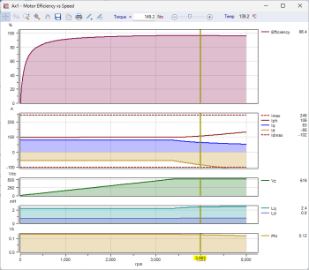 In the chart above right, the motor model is charted across its speed range, with efficiency in the 1st plot, currents including Iph and its vectors Iq & Id in the 2nd plot, bus voltage in the 3rd plot, inductance vectors Lq & Ld in the 4th plot, where (Ld-Lq) forms the basis of the reluctance torque, and finally is flux Phi [Vs] in the 5th plot.