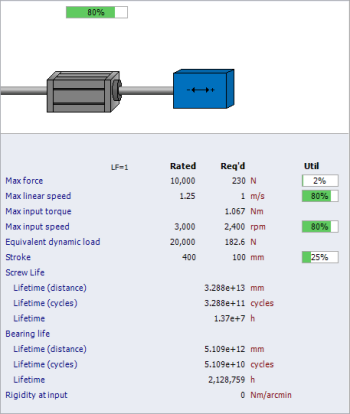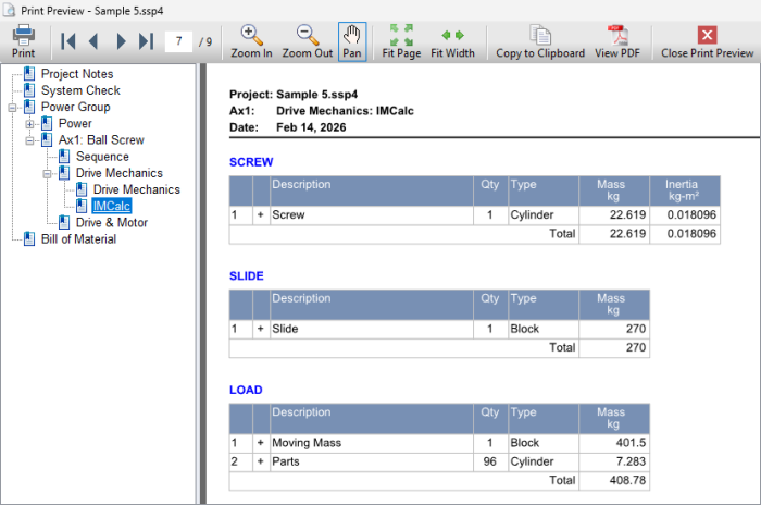Image below is from the Sample 5 project, with the Ball Screw mechanism 3 components defined by IMCalc - Screw, Slide and Load.